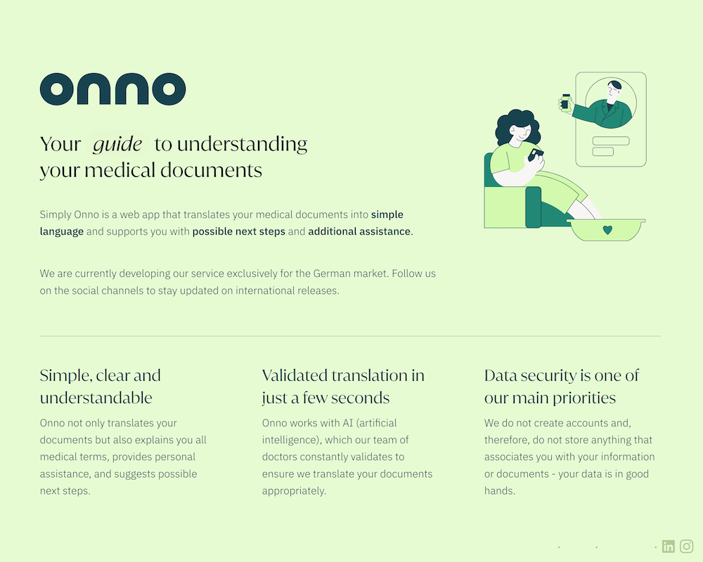 Auch Simply Onno verfolgt das Ziel, medizinisches Fachchinesisch zu entwirren und setzt dabei auf die Expertise von Medizinern. Patienten erhalten hier die Möglichkeit, ihre Dokumente einfach einzureichen und bekommen eine laienverständliche Erläuterung zurück. Der Fokus liegt klar darauf, die Patientenkompetenz zu stärken, damit Betroffene auf Augenhöhe mit ihren behandelnden Ärzten kommunizieren können.