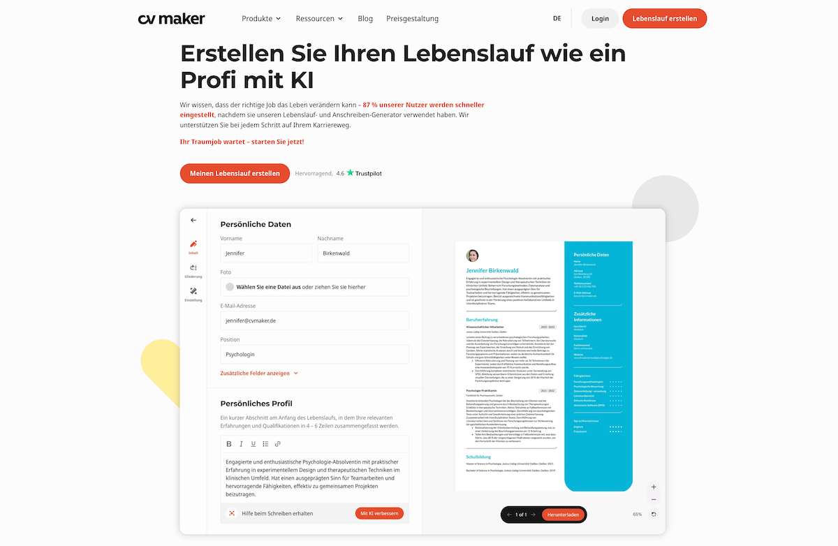 - CVMaker.de ist unser Top-Tipp, weil es eine all-in-one-Lösung mit professionellen Vorlagen, KI-Unterstützung und Zusatzfunktionen rund um die Bewerbung bietet. Wenn du auf höchste Qualität und umfangreiche Features Wert legst, liegst du hier richtig – und die kleine Gebühr für Premium lohnt sich in unseren Augen für den Karrierestart.