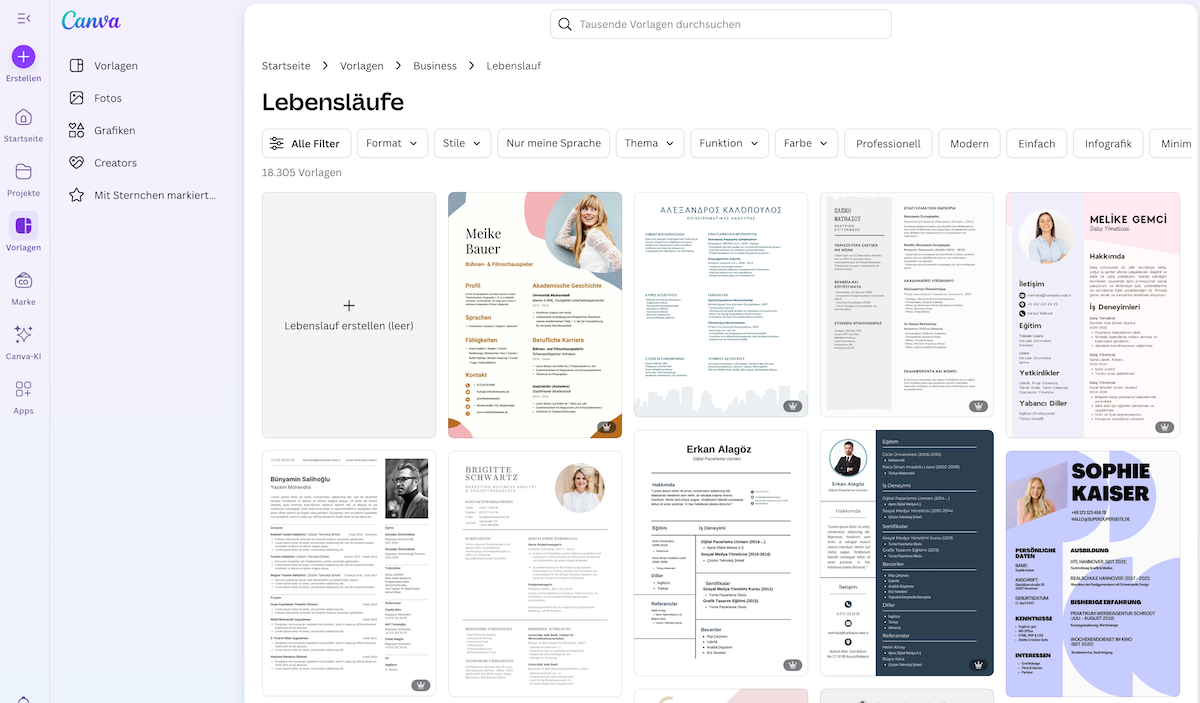 Wer es individuell mag und Spaß an kreativem Gestalten hat, sollte einen Blick auf Canva werfen. Canva ist eigentlich ein universelles Online-Design-Tool, das von Social-Media-Grafiken bis zu Postern alles gestalten kann. Aber auch für Lebensläufe gibt es dort unzählige Vorlagen. Der große Vorteil: Kreative Gestaltungsmöglichkeiten ohne Ende. Du kannst aus einer riesigen Bibliothek von Schriftarten, Farbschemen und Designelementen wählen und deinen Lebenslauf wirklich einzigartig machen. Für angehende Designer, Marketing-Leute oder alle, die aus der Masse herausstechen wollen, ist Canva daher super geeignet.