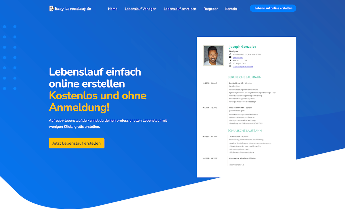 Wie der Name schon vermuten lässt, ist Easy-Lebenslauf.de auf einfache und schnelle Erstellung von Lebensläufen ausgelegt. Dieses Tool ist ein Geheimtipp für alle, die es eilig haben: Du kannst hier ohne Registrierung sofort loslegen Das ist perfekt, wenn du z.B. spontan eine Bewerbung fertig machen musst und nicht erst einen Account anlegen möchtest. Trotz der Simplizität bietet Easy-Lebenslauf.de alles Nötige, um einen soliden Lebenslauf zu erstellen.