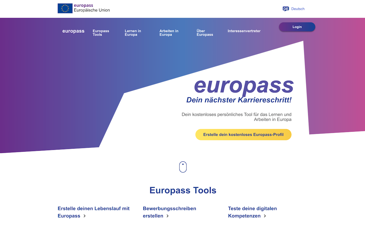 Zuletzt in unserer Top-Liste stellen wir Europass vor – ein etwas anderer Kandidat, denn hierbei handelt es sich nicht um ein kommerzielles Tool, sondern um eine Initiative der EU. Über das Europass-Portal kannst du kostenlos einen Lebenslauf in einem standardisierten Format erstellen, das in ganz Europa anerkannt ist. Gerade wenn du planst, dich auch im Ausland zu bewerben, kann der Europass-Lebenslauf sinnvoll sein, da Personalverantwortliche in anderen Ländern dieses Format oft kennen.