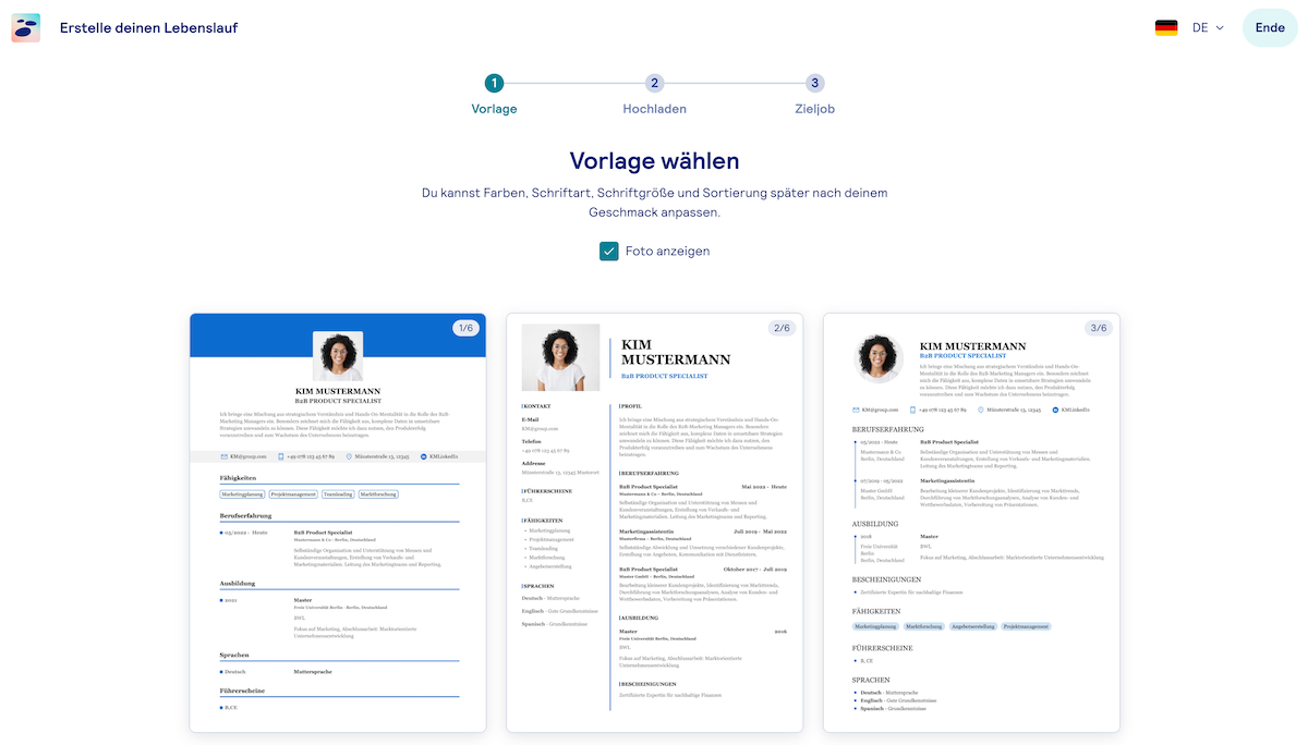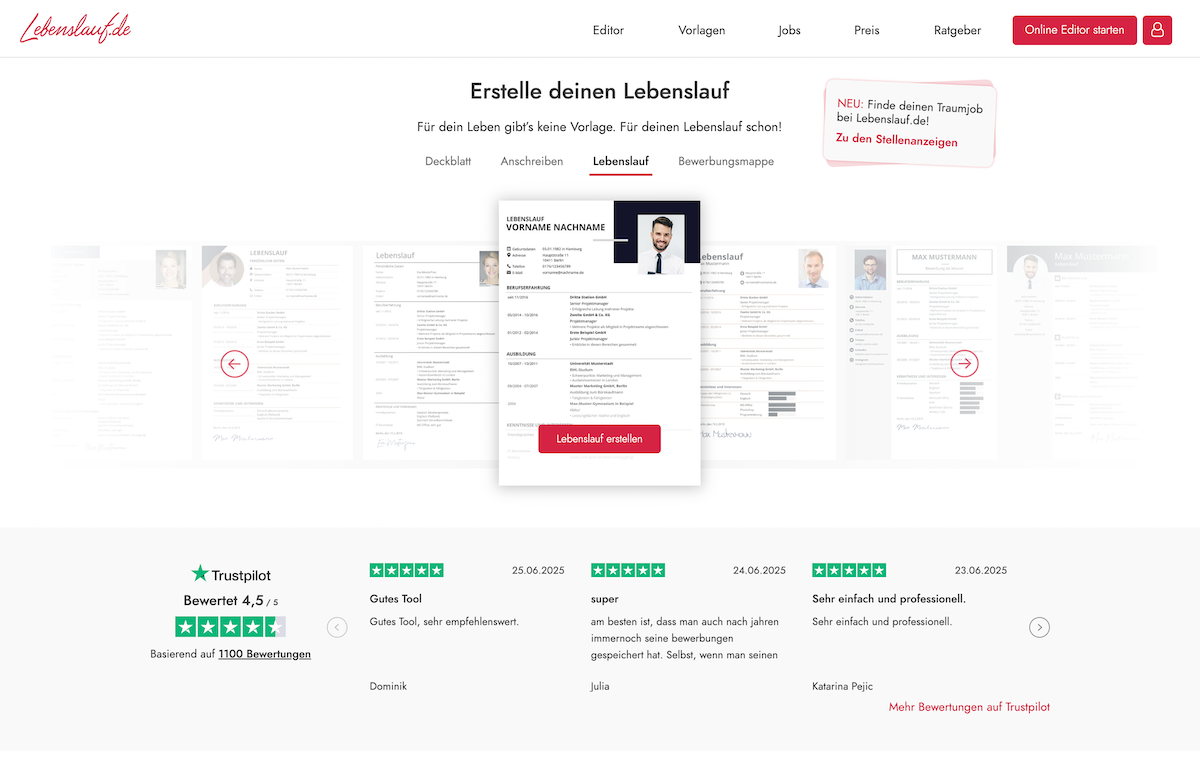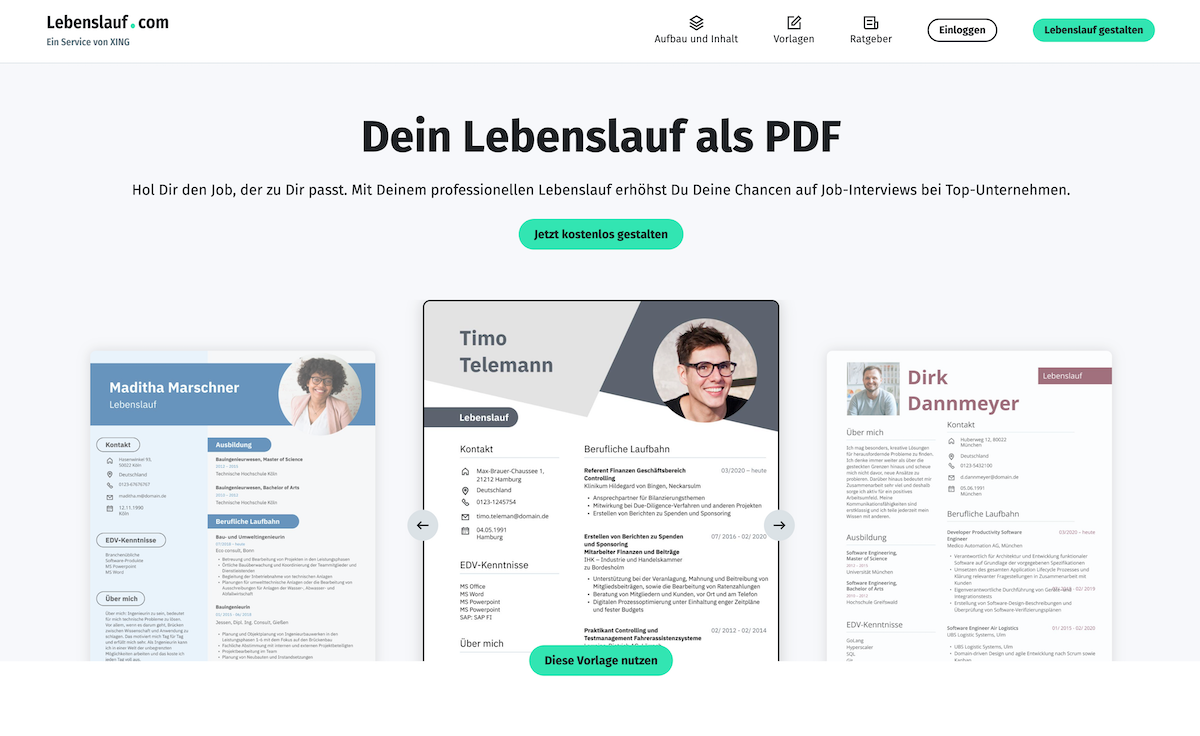 Lebenslauf.com sichert sich einen Platz in unserer Top-Liste als einfacher und solider Online-Editor für Lebensläufe. Dieser Dienst wird vom Business-Netzwerk XING bereitgestellt und ist vor allem für seine unkomplizierte Bedienung bekannt. Die Erstellung erfolgt in einem übersichtlichen 3-Schritte-Prozess: Daten eingeben, Vorlage auswählen, Feinschliff vornehmen – und schon ist dein Lebenslauf fertig. Das macht Lebenslauf.com besonders attraktiv für Berufseinsteiger, die noch wenig Erfahrung mit Bewerbungstools haben.