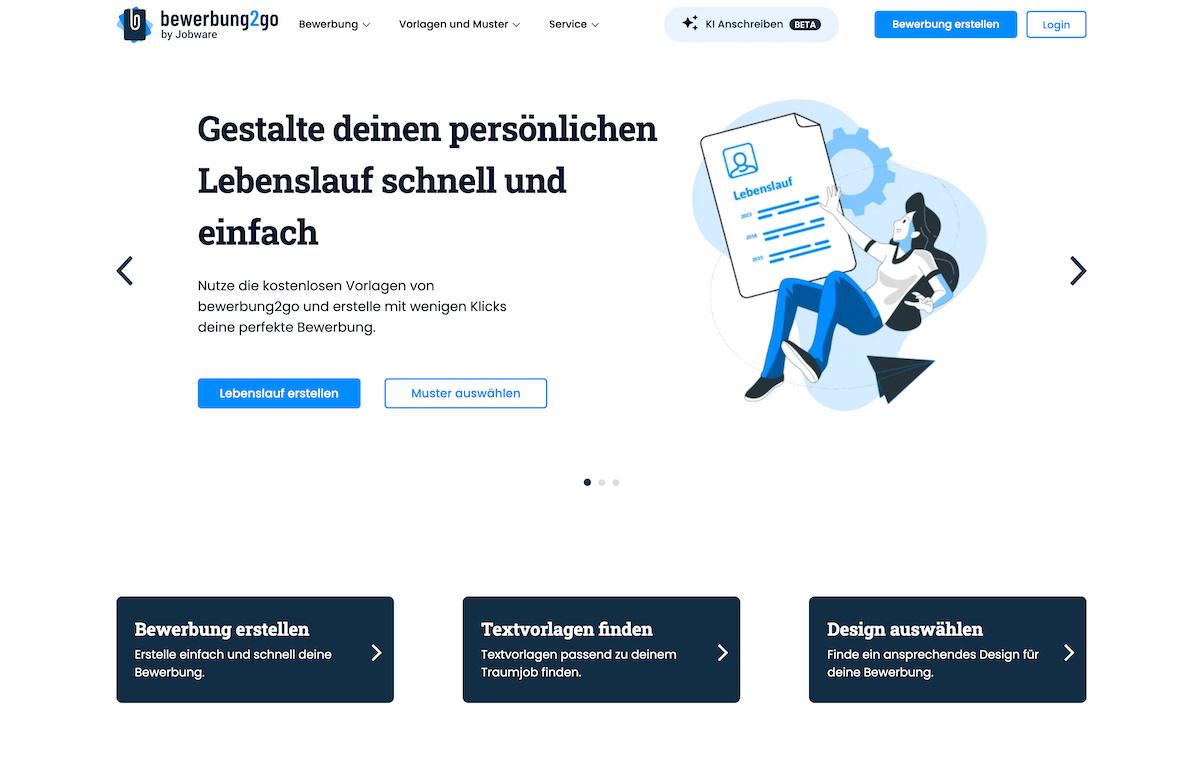 Auf Platz 2 steht Bewerbung2go.de, ein Angebot vom bekannten Jobportal Jobware. Dieser kostenlose Lebenslauf-Generator richtet sich vor allem an Bewerber, die schnell und unkompliziert professionelle Unterlagen erstellen möchten. Bewerbung2go stellt eine große Auswahl an Bewerbungsvorlagen und -mustern zur Verfügung, darunter auch branchenspezifische Designs. Über den integrierten Online-Editor kannst du deinen Lebenslauf bequem Schritt für Schritt eingeben. Auch Anschreiben lassen sich mit dem Tool verfassen – praktisch, so hast du alle Teile der Bewerbung beisammen.