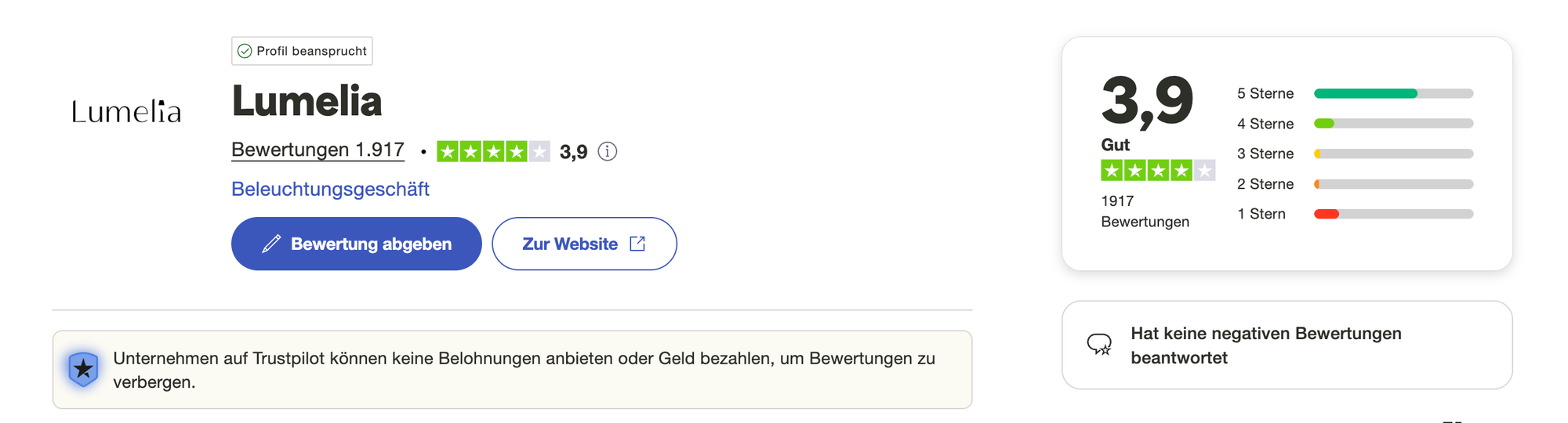 Auf Trustpilot, einer der bekanntesten Bewertungsplattformen, weist Lumelia gemischte Kundenreaktionen auf. Insgesamt wird der Shop dort mit 3,9 von 5 Sternen (TrustScore „Gut“) bewertet, basierend auf etwa 1.917 Bewertungen (Stand Juli 2025). Die Mehrheit – rund 65 % – vergibt 5 Sterne, doch zugleich sind etwa 16 % der Bewertungen mit der Mindestnote 1 Stern äußerst negativ. Dieses ungewöhnlich breite Spektrum an Bewertungen deutet auf sehr unterschiedliche Kundenerfahrungen hin.