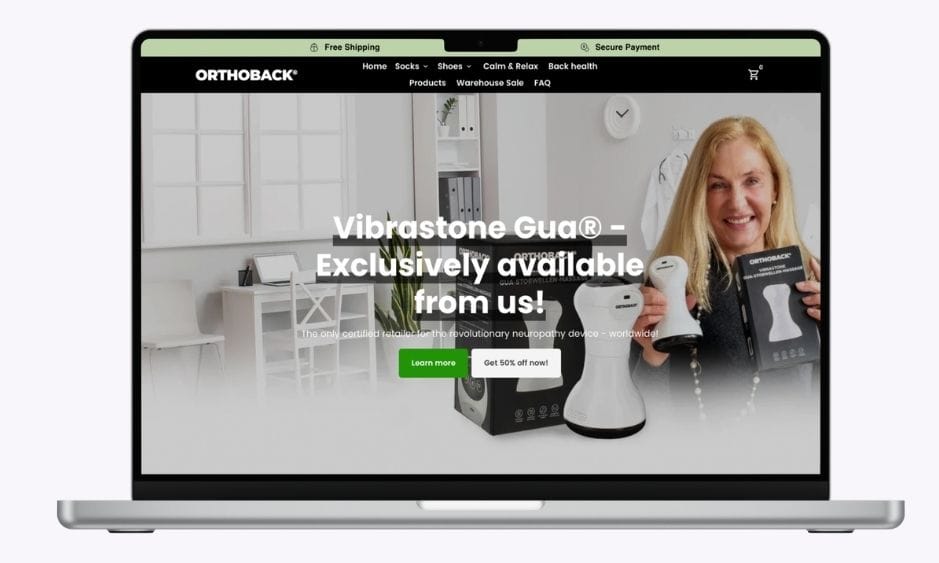 Orthoback präsentiert sich als Fachhändler für Gesundheits- und Wellnessprodukte. Im Mittelpunkt steht vor allem das Gerät „Orthoback Gua Vibrastone“, das als „innovatives Wellnessgerät“ zur Linderung von Verspannungen und Förderung der Durchblutung angepriesen wird. Dieses elektrisch betriebene Massage- und Therapiegerät soll mit Vibration, Wärme und Gua-Sha-Technik insbesondere Nervenschmerzen (Neuropathien) in Füßen und Beinen lindern.