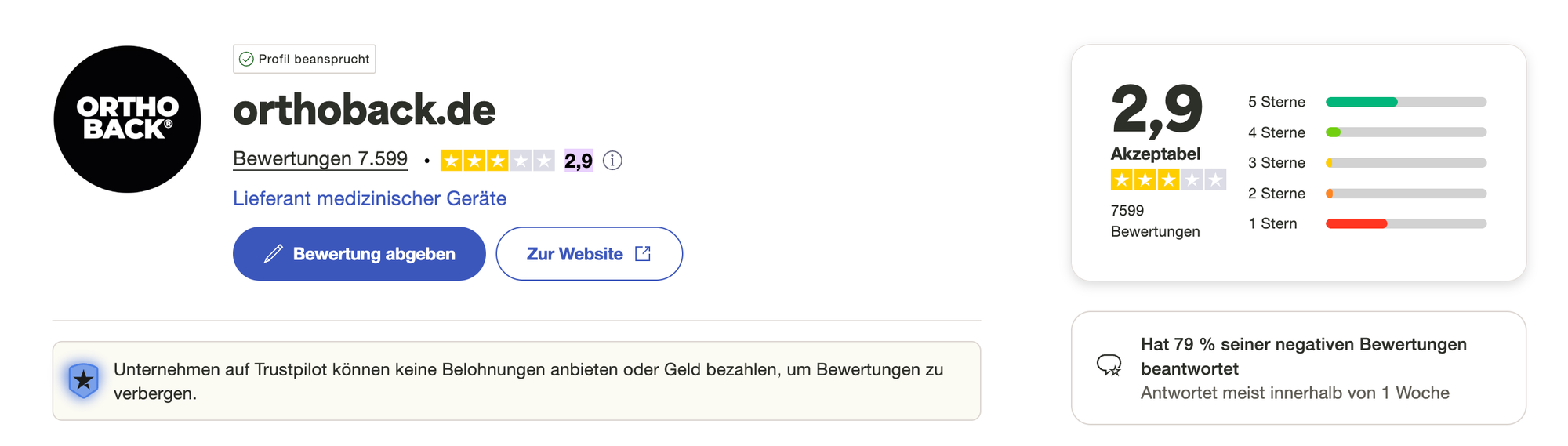 Schaut man über die Hochglanz-Selbstdarstellung hinaus, zeigt sich ein deutlich anderes Bild. Kundenbewertungen auf unabhängigen Portalen wie Trustpilot, Foren und sozialen Netzwerken berichten in großer Zahl von negativen Erfahrungen. Auf Trustpilot erzielt Orthoback.de bei knapp 7.600 Bewertungen lediglich einen TrustScore von 2,9 von 5 Punkten, also „akzeptabel“ bis mangelhaft. Zum Vergleich: Namhafte seriöse Online-Shops liegen meist bei 4–5 Sternen. 82 % der Bewertungen für Orthoback.com (international) gaben sogar nur 1 Stern, also „ungenügend“. Die häufigsten Kritikpunkte sind dabei immer wieder dieselben: