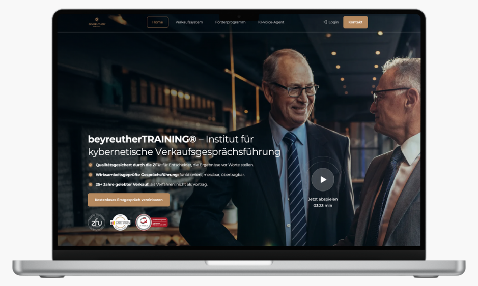 Carsten Beyreuther positioniert sich über Gesprächskybernetik und eine ZFU-zugelassene Fern-Ausbildung. Inhaltlich geht es um systematische Gesprächslogik, individuelle Leitfäden und „verkaufen ohne Druck“. Für Unternehmen ist das besonders interessant, wenn sie Vertrieb nicht nur trainieren, sondern strukturiert ausbilden wollen.